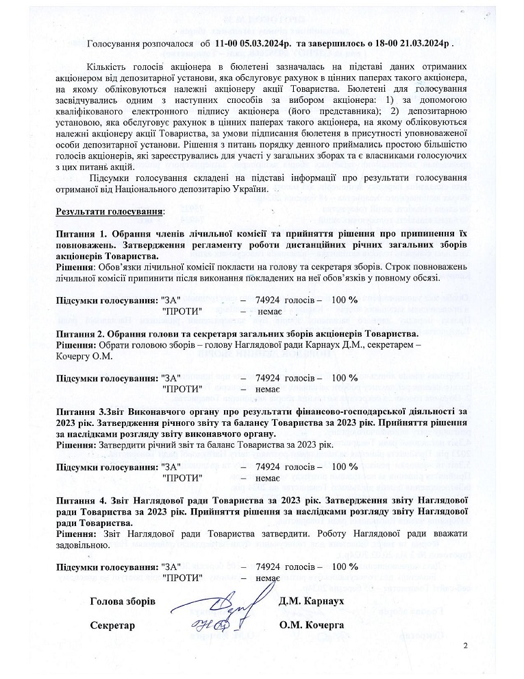 Голосування на загальних зборах з питань порядку денного проводиться виключно з використанням бюлетеня для голосування. Голосування проводиться шляхом подання заповнених бюлетенів для голосування депозитарній установі, яка обслуговує рахунок акціонера в цінних паперах, на якому обліковуються належні акціонеру акції Товариства на дату складення переліку акціонерів, які мають право на участь у загальних зборах Товариства на адресу електронної пошти, так і шляхом подання бюлетенів в паперовій формі. Кількість голосів акціонера в бюлетені зазначається на підставі даних отриманих акціонером від депозитарної установи, яка обслуговує рахунок в цінних паперах такого акціонера, на якому обліковуються належні акціонеру акції Товариства. Акціонер в період проведення голосування може надати депозитарній установі, яка обслуговує рахунок в цінних паперах такого акціонера, лише один бюлетень для голосування з одних і тих самих питань порядку денного. Бюлетень, що був отриманий депозитарною установою після завершення часу, відведеного на голосування, вважається таким, що не поданий.