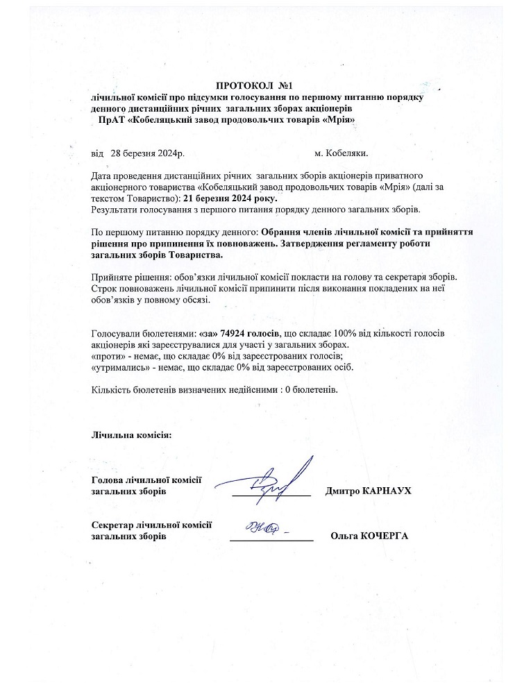 Питання 1. Обрання членів лічильної комісії та прийняття рішення про припинення їх повноважень. Затвердження регламенту роботи дистанційних річних загальних зборів акціонерів Товариства. |