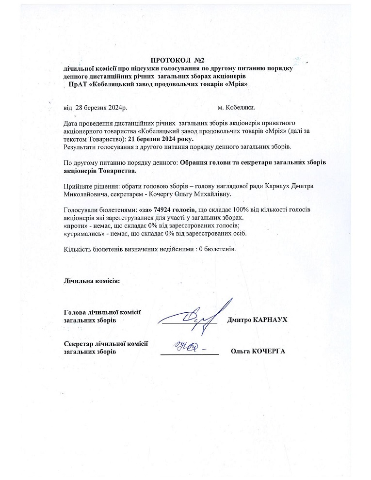 ПрАТ "Кобеляцький завод продовольчих товарів "МРІЯ" (код ЄДРПОУ 00382668) оприлюднює річну інформацію емітента цінних паперів за 2023 рік.