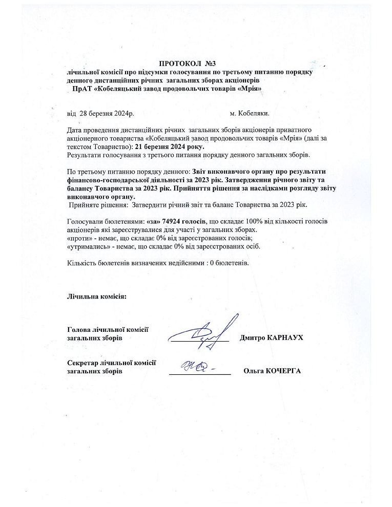 Питання 3. Звіт Виконавчого органу про результати фінансово-господарської діяльності за 2023 рік. Затвердження річного звіту та балансу Товариства за 2023 рік. Прийняття рішення за наслідками розгляду звіту виконавчого отгану. |