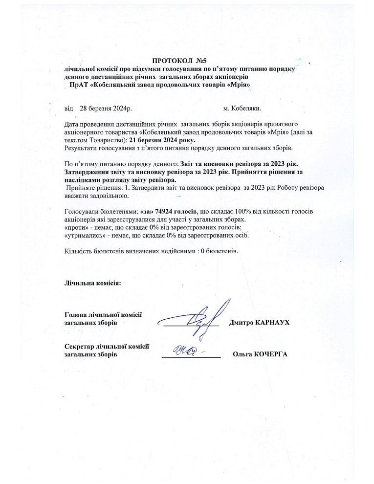 5. Звіт та висновки ревізора за 2023 рік. Затвердження звіту та висновків ревізора за 2023 рік. Прийняття рішення за наслідками розгляду звіту ревізора.