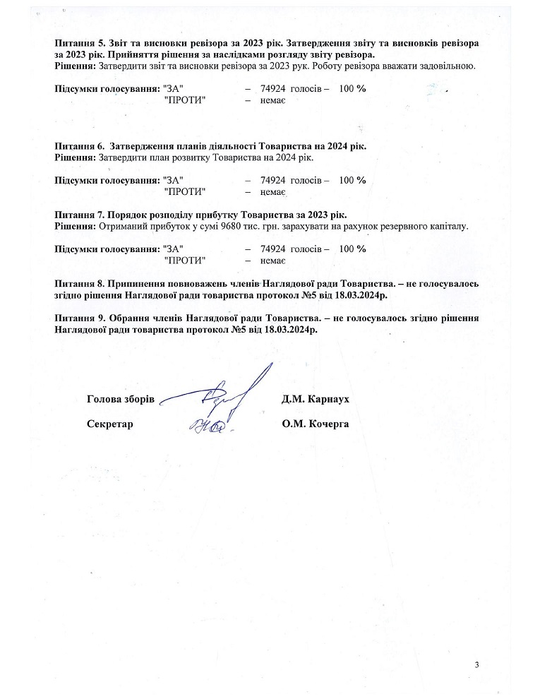 Питання 3. Звіт Виконавчого органу про результати фінансово-господарської діяльності за 2023 рік. Затвердження річного звіту та балансу Товариства за 2023 рік. Прийняття рішення за наслідками розгляду звіту виконавчого отгану. |