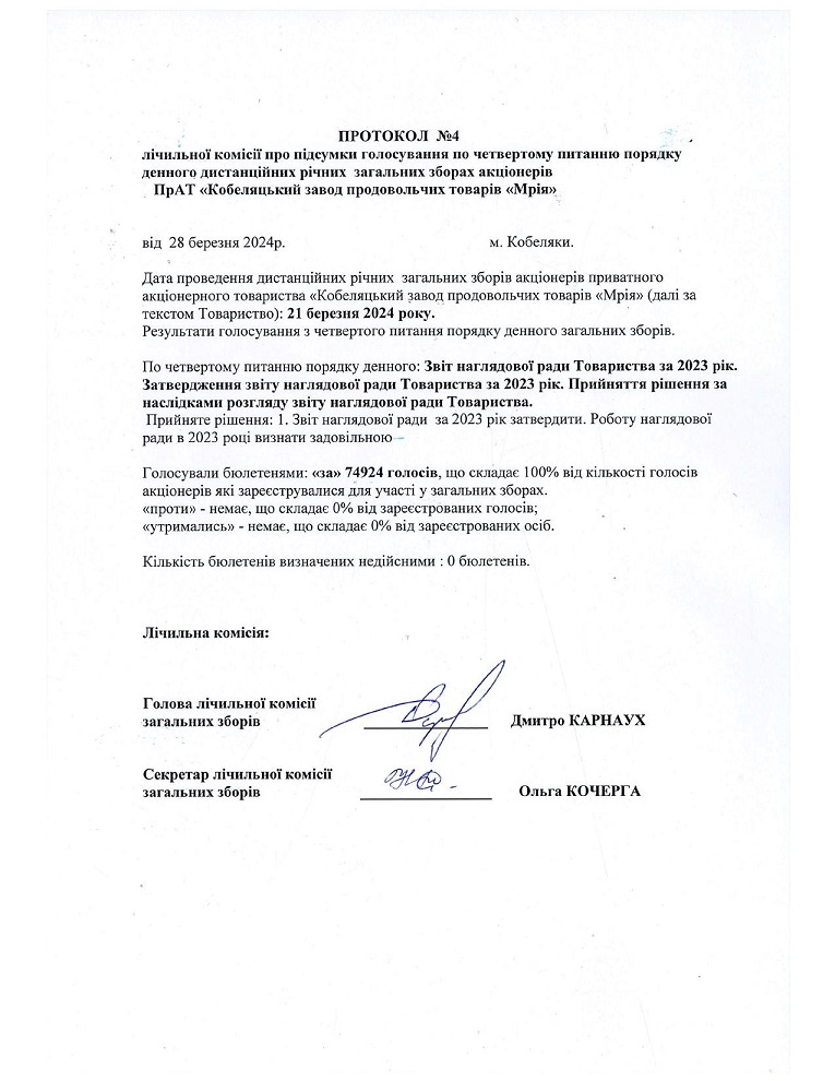 Питання 4. Звіт Наглядової ради Товариства за 2023 рік. Затвердження звіту Наглядової ради Товариства за 2023 рік. Прийняття рішення за наслідками розгляду звіту Наглядової ради Товариства. |