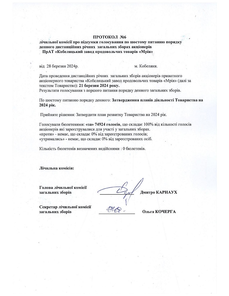Питання 6. Затвердження планів діяльності Товариства на 2024 рік. |