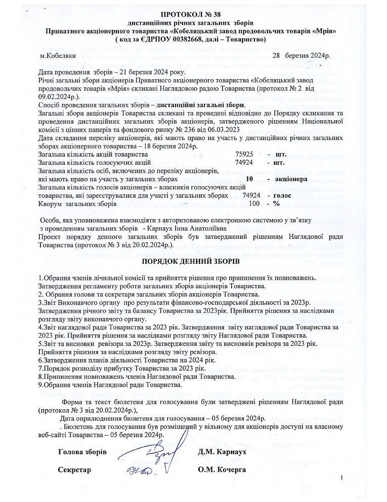ПрАТ "Кобеляцький завод продовольчих товарів "МРІЯ" (код ЄДРПОУ 00382668) оприлюднює річну інформацію емітента цінних паперів за 2023 рік.